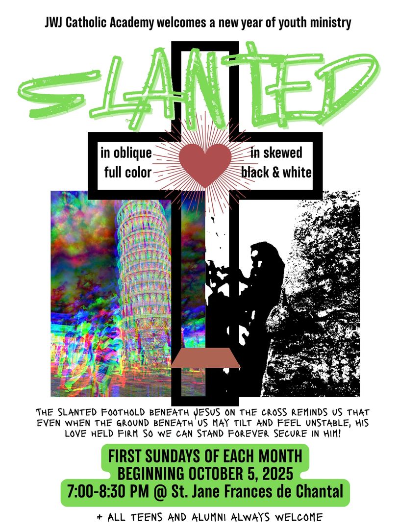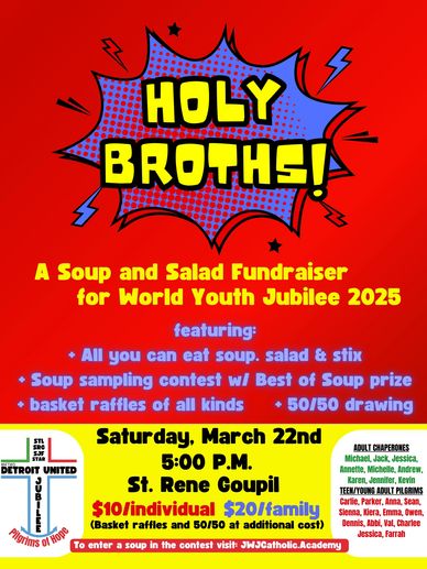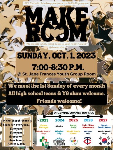 After a life changing pilgrimage to ROME, Italy for World Youth Jubilee '25, our youth ministry program will have meetings October 2025 through May 2026 with epic summer outings including MISSION TEXAS in 2026 and World Youth Day in Seoul in 2027. For information,