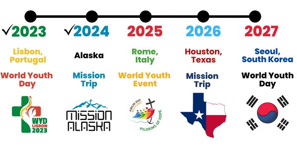 OUR SUMMERS WILL BE BUSY, ADVENTUROUS, AND LIFE CHANGING! Beginning with our World Youth Day Trip to Portugal in 2023 and ending with our World Youth Day Trip to South Korea in 2027, this 5 year span will be EPIC as we share our one-of-a-kind frenzied faith with the whole of our country and world!